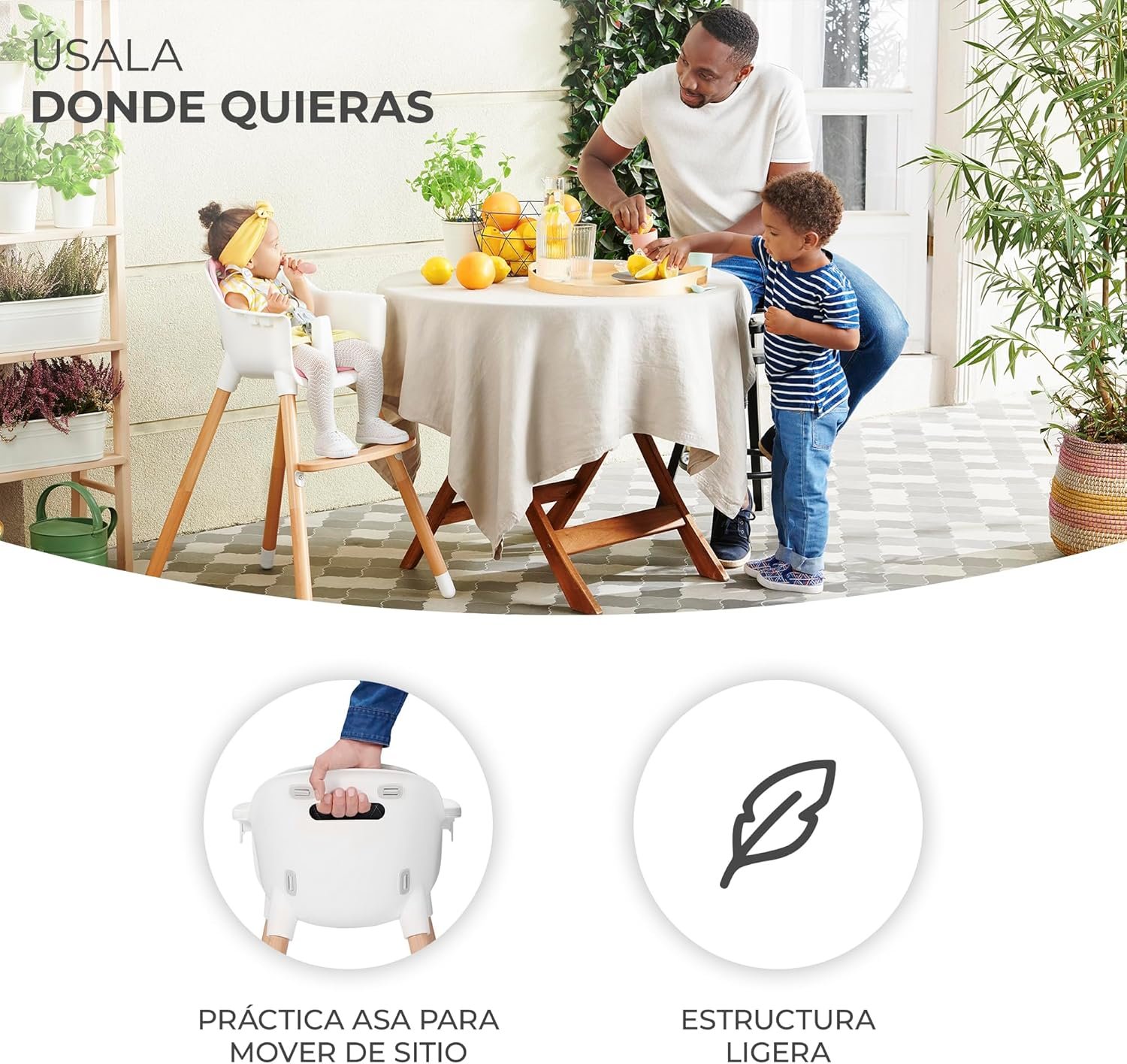 • Compatibilidad: la posibilidad de usarla en mesas familiares o convertirla en pequeño asiento la hace útil en distintos escenarios (comidas en casa, visitas, abuelos).